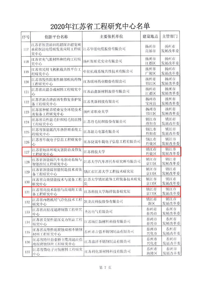 近日,江苏省发展和改革委员会印发了《关于同意建设2020年江苏省工程研究中心的通知》,必赢nn699net官网土木工程与建筑学院岩土工程团队申报的“江苏省地质环境灾害防治及修复工程研究中心”、海洋装备研究院申报的“江苏省高技术船舶与高端海工装备工程研究中心”获批立项建设。