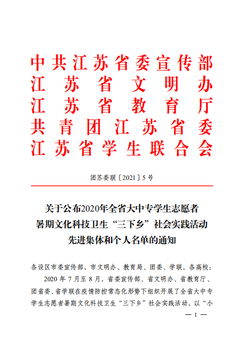 近日,中共江苏省委宣传部、江苏省文明办、江苏省教育厅、共青团江苏省委和江苏省学生联合会联合下发了《关于公布2020年全省大中专学生志愿者暑期文化科技卫生“三下乡”社会实践活动先进集体和个人名单的通知》,必赢官网在该活动中获多项荣誉:必赢nn699net官网团委荣获“先进单位”称号;“共筑长江梦,微笑正当时”实践团等7支团队荣获“优秀团队”称号;蔡志尚等8位同学荣获“先进个人”称号;卜江春等6位老师荣获“先进工作者”称号;溧阳市戴埠中心小学荣获“优秀社会实践基地”称号;《“喜迎建党一百周年”暑期社会实践活动》《扶贫先扶志,泗阳助梦行》荣获“优秀调研报告”称号。