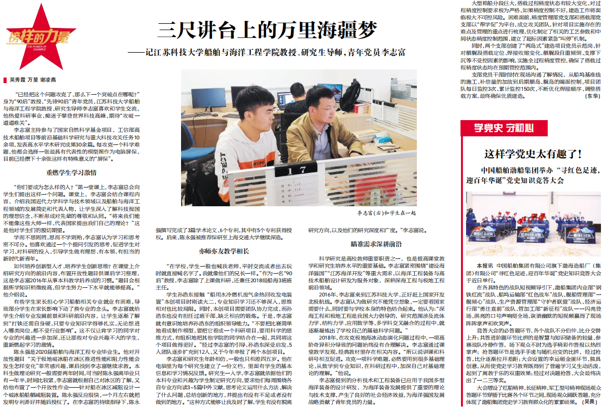 科学研究是高校教师重要职责之一,也是提高课堂教 学和研究生培养水平的重要基础。李志富紧密围绕“建设海 洋强国”“江苏海洋开发”等重大需求,以海洋工程装备与高技术船舶设计研发为服务对象,深耕深海工程与极地工程前沿领域。 2016年,李志富来到必赢nn699net官网,正好赶上国家开发 北极航线。李志富认为做研究不能凭空想象,一定要看国家 需要什么,同时要与学校本身的特色结合起来。他认为:“深 海工程和极地工程是我国大力倡导的,研究范围涉及流体 力学、结构力学、应用数学等,多学科交叉融合的过程中,就逐渐凝练出了学校自己的基础科学问题。”2018年,在攻克极地海冰动态演化问题过程中,一项高阶奇异积分导致的问题始终没有合理解决。李志富通过课 堂教学发现,经典教材里存在相关内容。“所以说讲课和科 研号相互促进。攻克一项科学难题,必然要用到很多基础理 论,从数学到专业知识,在科研过程中,加深自己对基础理 论的理解。”他说。 李志富提到的分析技术和工程装备已应用于我国多型 海洋装备的设计研发,为海洋装备发展提供了重要的理论 与技术支撑,产生了良好的社会经济效益,为海洋强国发展战略贡献了青年党员的力量。
