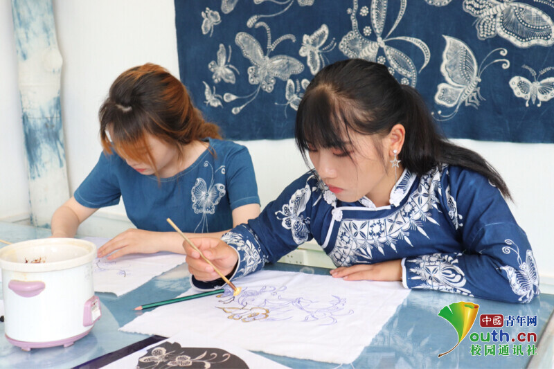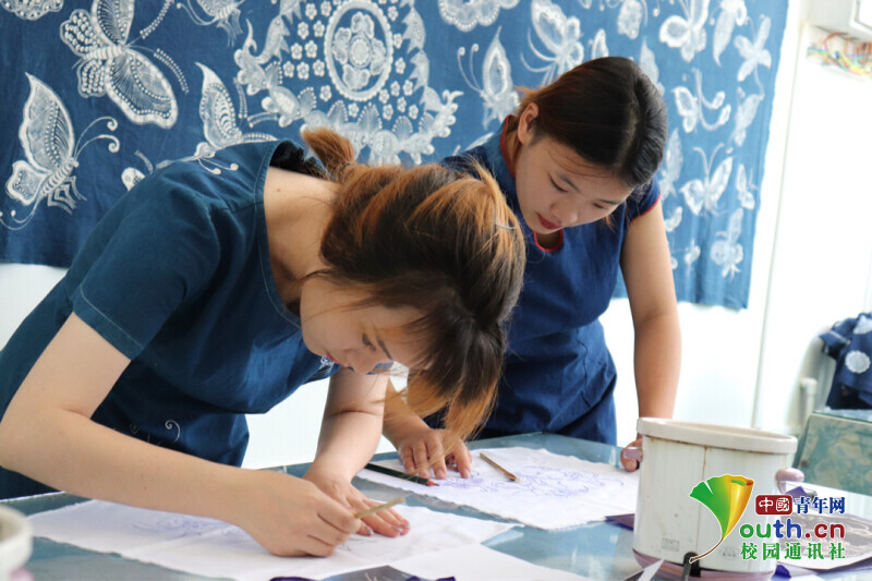图为苗族蜡染传承人龙鹿老师教实践团成员上蜡。