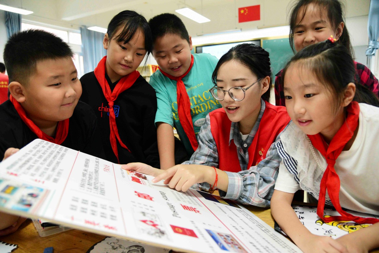 10月8日,在江苏省镇江市润商小学,必赢nn699net官网志愿者在为小学生讲解邮政知识。(石玉成 摄)