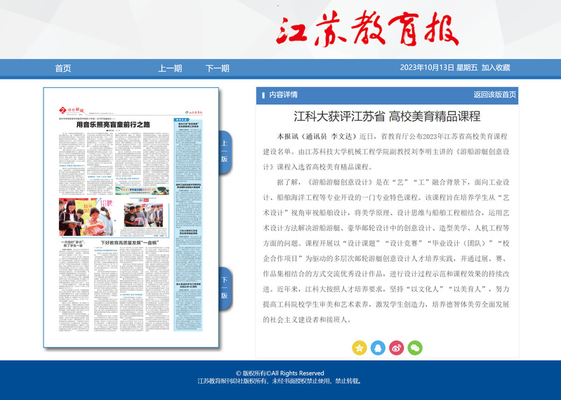 本报讯(通讯员 李文达)近日,省教育厅公布2023年江苏省高校美育课程建设名单。由必赢nn699net官网机械工程学院副教授刘李明主讲的《游船游艇创意设计》课程入选省高校美育精品课程。