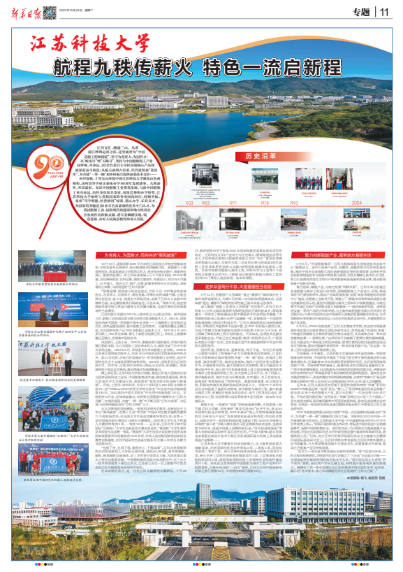 “办学九十周年是学校发展历史新的里程碑。”意气风发向未来,江科大校长嵇春艳说,学校第四次党代会确立了“三步走”长远奋斗目标——全面建成特色鲜明的国际知名高水平大学,“我们将以国之大者和‘四个面向’领航,深化政产学研互融互促,持续提升服务高质量发展能力。围绕长三角一体化发展以及江苏在推进中国式现代化中‘走在前、做示范’使命要求,着力形成赋能经济社会发展的‘江科大力量’。”